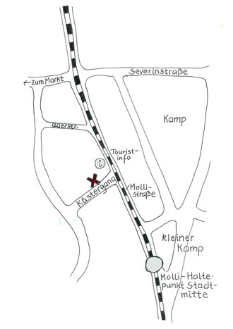 Wegbeschreibung: von der Mollistraße zwischen dem Restaurant Mesogios und der Bäckerei Braun nach Norden in den Küstergang einbiegen und 10 m laufen